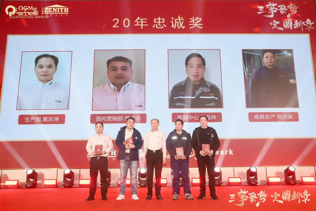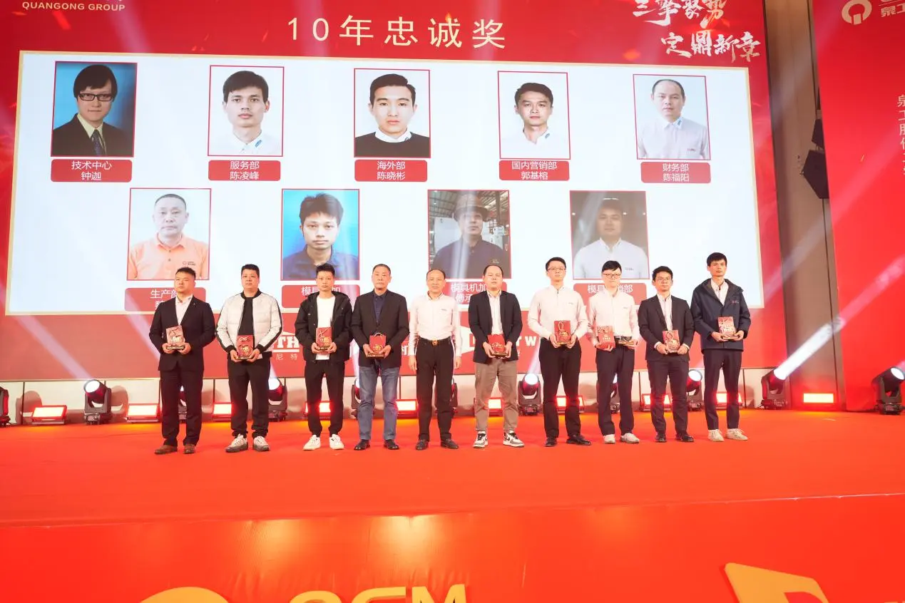 వార్షిక సమావేశంలో, 10-సంవత్సరాలు, 20-సంవత్సరాలు మరియు 30-సంవత్సరాల లాయల్టీ అవార్డుల కోసం గొప్ప అవార్డుల వేడుక కూడా జరిగింది. క్వాంగాంగ్ మెషినరీ కో., లిమిటెడ్ యొక్క స్థిరమైన అభివృద్ధి మరియు దాని శాశ్వతమైన కార్పొరేట్ సంస్కృతి యొక్క దృఢమైన పునాదిని పూర్తిగా ప్రదర్శిస్తూ, కంపెనీతో చేతులు కలిపి మరియు కలిసి ఎదిగిన ఉద్యోగుల సమూహం వేదికపైకి వచ్చింది.